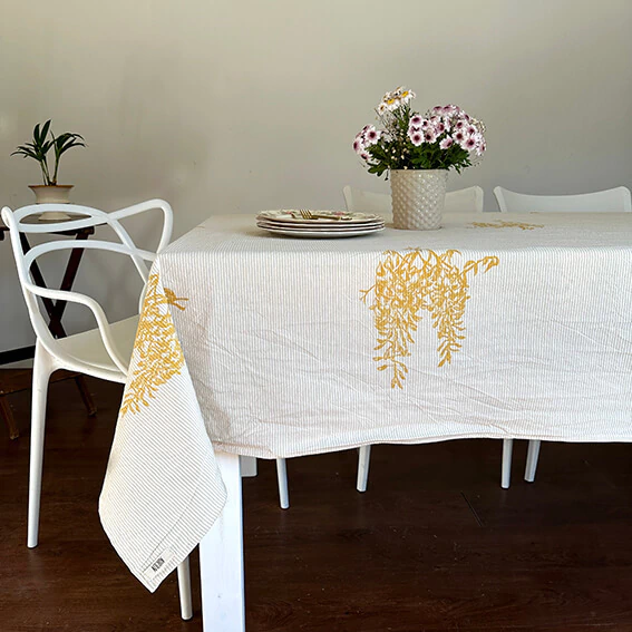 Mantel de tela tussor rayado con línea arena, estampado a mano en serigrafía. diseños 100% propios